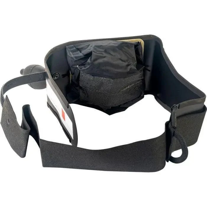 The integrated 300 mmHg pressure relief valve and green-indicator gauge eliminate guesswork: the bladder is inflated until the gauge reads green (~250 mmHg), and the built-in valve automatically prevents over-pressurization. The ratcheting buckle ensures all strap slack is removed before bladder inflation, reducing operator variability. Compression Works lists over 60 peer-reviewed publications supporting the device. The only case report of abdominal use in real trauma — a military patient in Afghanistan with bilateral lower-limb amputations — showed almost immediate hemorrhage control effect with no evidence of renal failure or ischemic bowel complications at 48-hour follow-up. The patient survived.