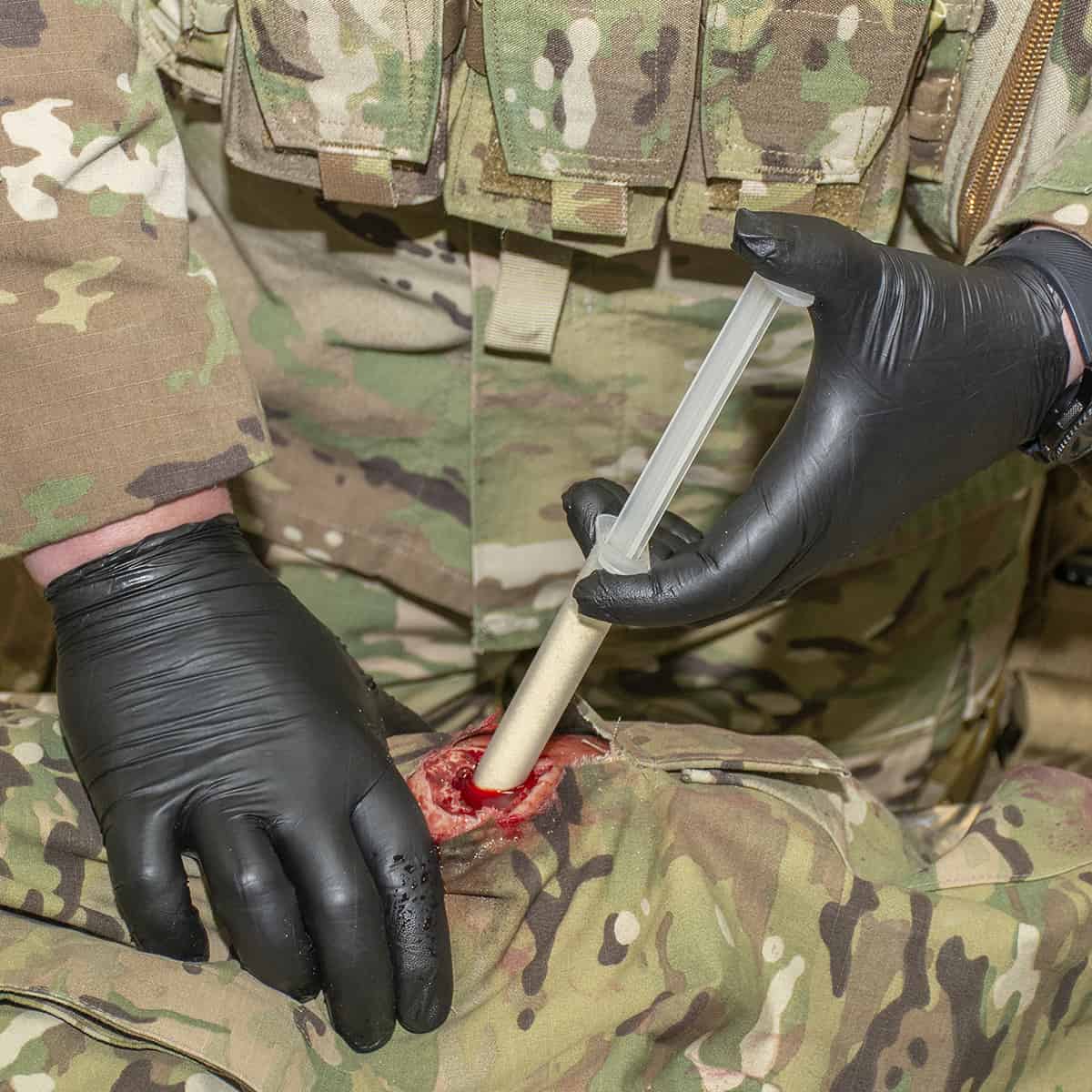The Celox-A solves a critical gap in pre-hospital trauma care: penetrating wounds with small entry diameters — typically from gunshots, blade injuries, and blast fragments — that are difficult or dangerous to pack with traditional gauze. Standard hemostatic gauze packing requires accessing the wound cavity with fingers, which is impossible in narrow-channel penetrating wounds. The Celox-A applicator is a pre-filled, syringe-style device that delivers 6 grams of Celox chitosan granules through a narrow tube inserted directly into the wound, reaching the bleeding source without wound enlargement or digital exploration.